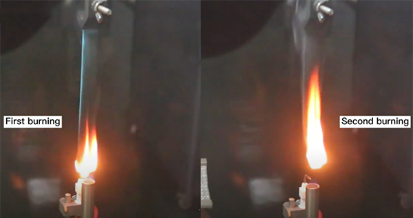 Trong thử nghiệm dưới ngọn lửa như trong video, thanh kiểm tra chống cháy đã được thử nghiệm hai lần trong 10 giây để quan sát thời gian đốt của ngọn lửa với vật thí nghiệm.